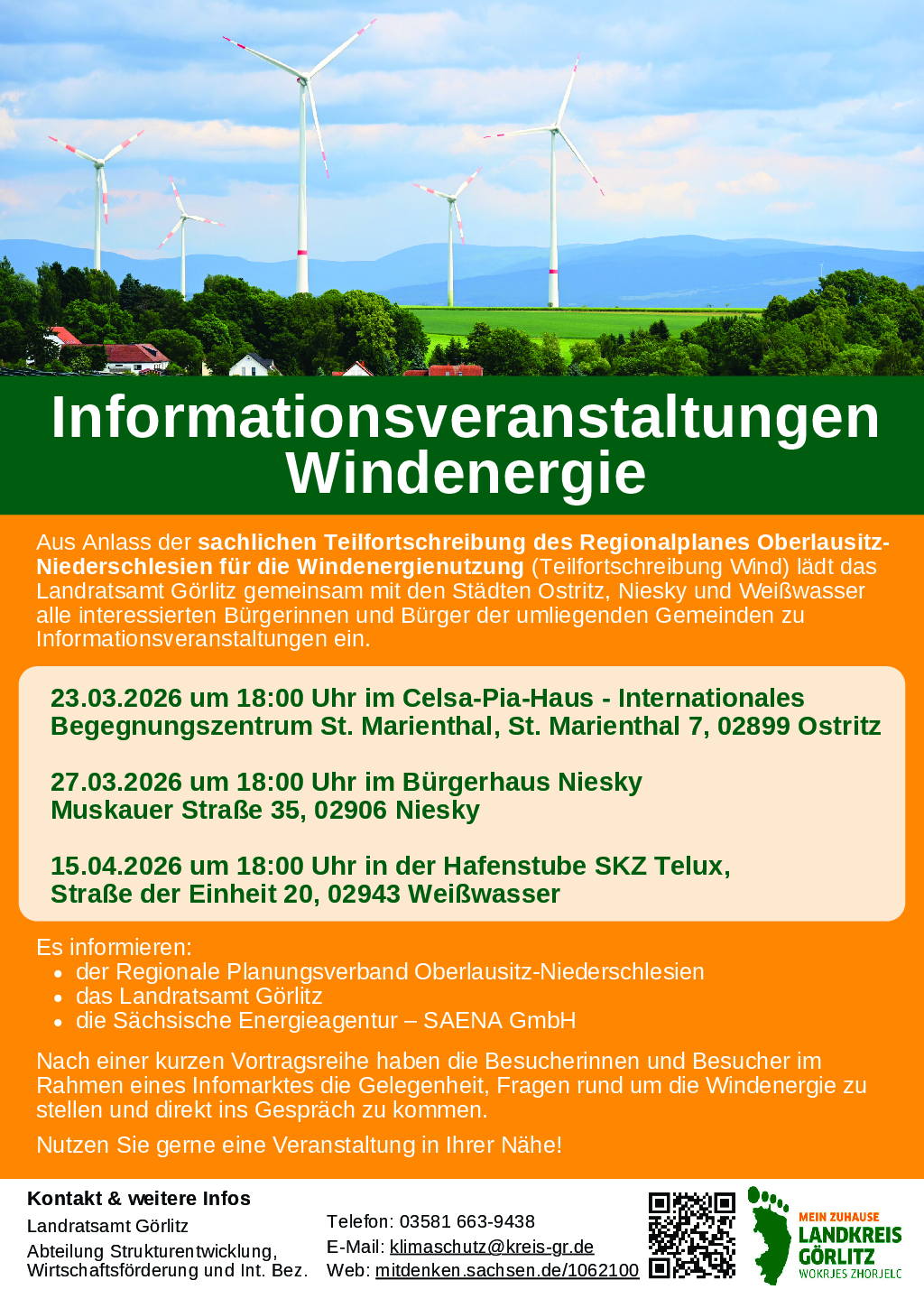 Der Ausbau der Windenergie ist ein zentraler Bestandteil der Energiewende in Sachsen. Im Rahmen der sachlichen Teilfortschreibung des Regionalplanes Oberlausitz-Niederschlesien zur Windenergienutzung werden derzeit durch den Regionalen Planungsverband mögliche Vorranggebiete für Windenergieanlagen neu bewertet und festgelegt. Um über den aktuellen Planungsstand zu informieren und Fragen zu beantworten, lädt das Landratsamt Görlitz gemeinsam mit den Städten Ostritz, Niesky und Weißwasser zu drei öffentlichen Informationsveranstaltungen im Landkreis ein.