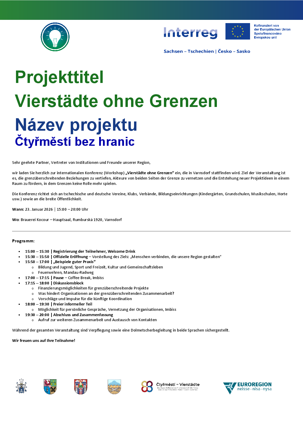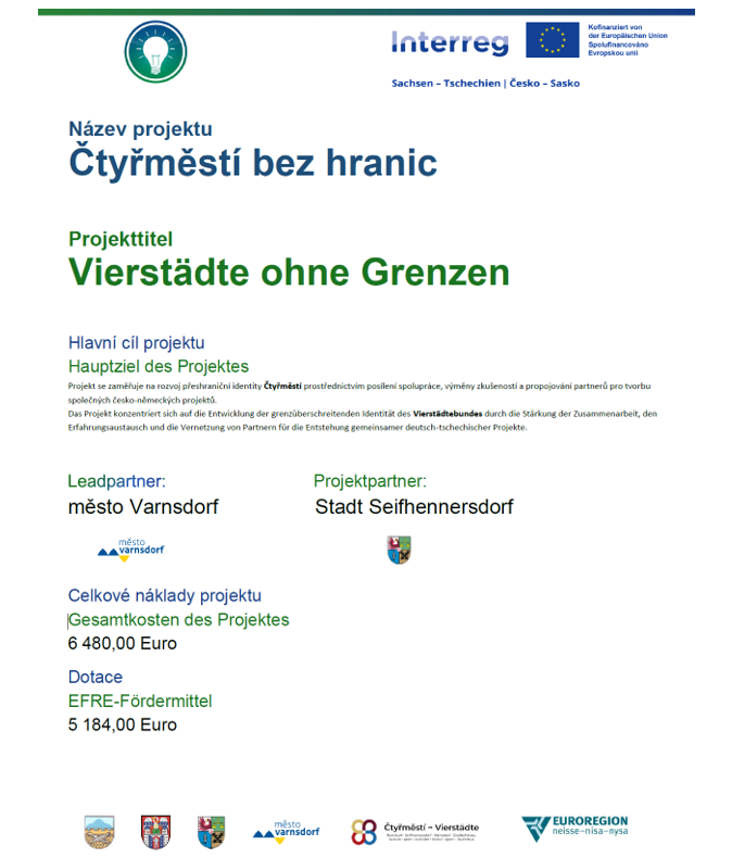 Im Rahmen der Vierstädtekooperation zwischen Rumburk, Varnsdorf, Großschönau und Seifhennersdorf laden wir alle interessierten Bürgerinnen und Bürger herzlich zu einem Bürgertreffen zur grenzüberschreitenden Zusammenarbeit ein.